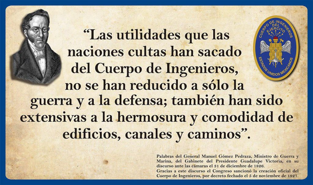 El día 5 de noviembre de 1827, siendo el Primer Presidente de la República, el ciudadano General de División Manuel Félix Fernández, mejor conocido como Guadalupe Victoria, se expidió el Decreto Presidencial sobre el Arreglo Definitivo del Cuerpo Nacional de Ingenieros.
