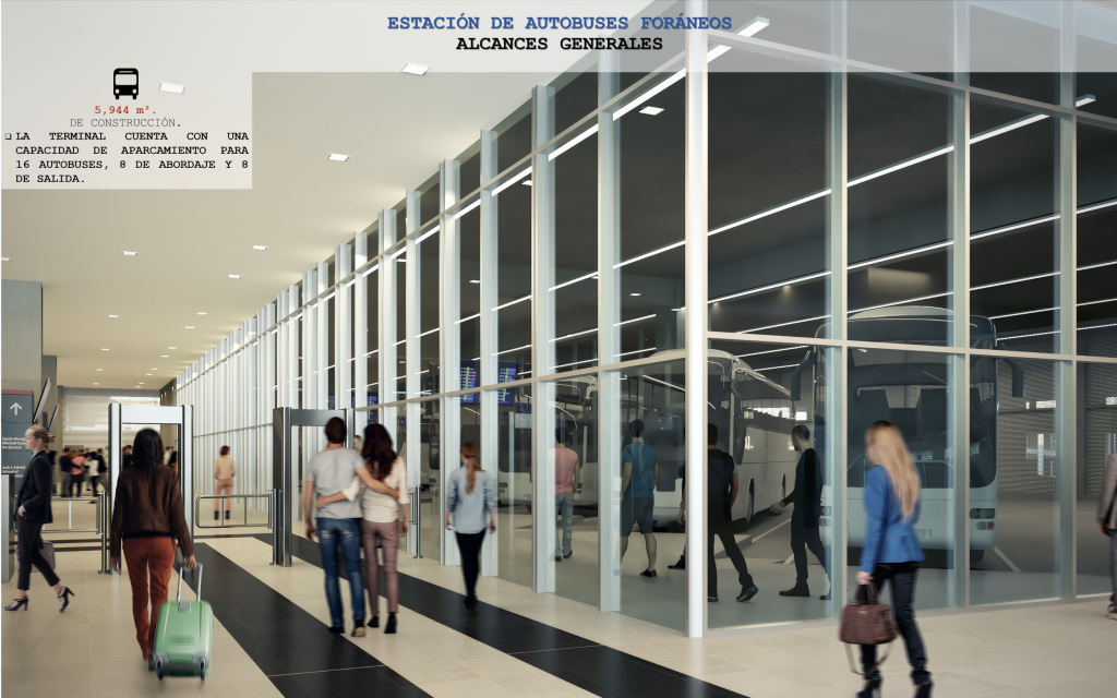 Dentro de la planta baja de la Terminal Intermodal de Transporte Terrestre se alojará una estación de autobuses para los pasajeros foráneos con capacidad para 16 cajones de autobuses, 8 cajones para abordaje y 8 cajones para salida, permitiendo a los usuarios el transportarse hacia otros destinos del país de una manera cómoda, rápida y segura.