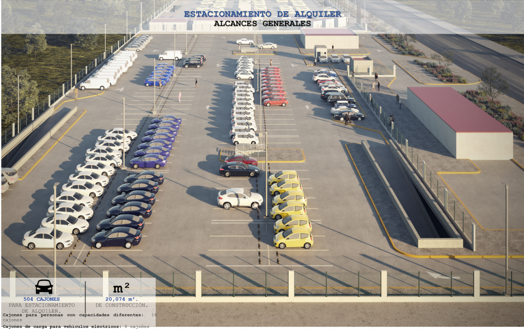 El estacionamiento de alquiler de coches permite a los usuarios tener la opción de los vehículos en renta, este estacionamiento considera instalaciones administrativas y de mantenimiento y contempla la construcción de más de 20,000 mil metros cuadrados de estacionamiento y brindan una capacidad de 504 cajones de estacionamiento.
