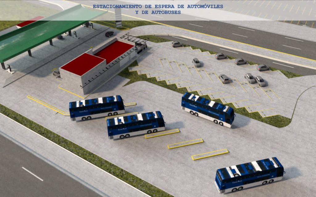 Otro estacionamiento similar, ubicado a un kilómetro de la terminal de pasajeros, será para autobuses, ya sean turísticos, foráneos, ejecutivos o de otra índole. Con un tiempo máximo de espera de 45 minutos, se encuentra en un área de construcción de 3,436 metros cuadrados con capacidad para 15 autobuses.