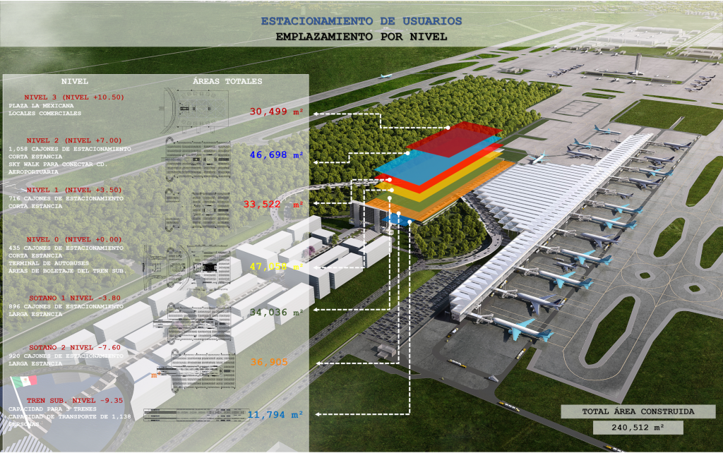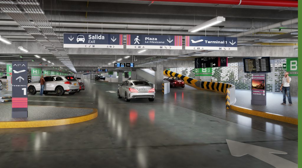 El estacionamiento tiene capacidad de 4,025 cajones repartidos en cinco niveles: dos subterráneos, dos elevados y uno a nivel de suelo. El estacionamiento se ubica estratégicamente entre la Ciudad Aeroportuaria y la terminal de pasajeros.