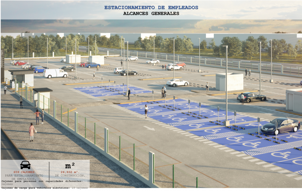 Como parte de los servicios de apoyo del Aeropuerto Internacional General Felipe Ángeles y con el objetivo de garantizar un espacio de estacionamiento para el personal operativo del AIFA se prevé la construcción de los estacionamientos de empleados con un área de 24,932 metros cuadrados con capacidad para 659 automóviles.