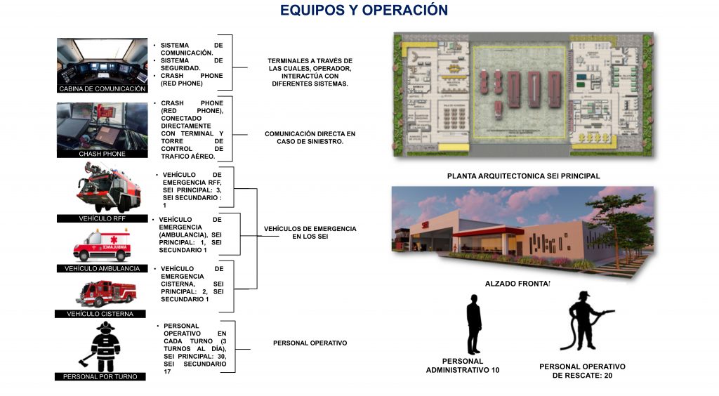 Cada uno de los Servicios de Extinción de Incendios (SEI) cuenta con vehículos RFF, por sus siglas en ingles (Rescue and Fire Fighting), vehículos cisterna, ambulancias y personal capacitado en tres turnos al día para poder dar respuesta las 24 horas de los 365 días del año.