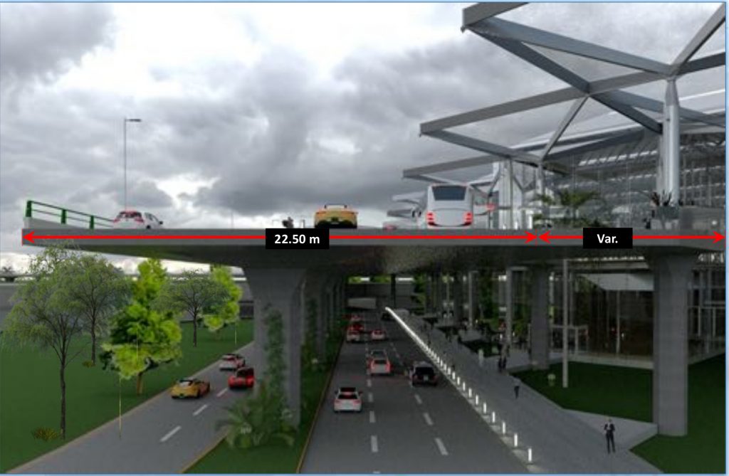 El Eje Troncal tendrá dos niveles para el acceso a las aceras de llegadas y salidas del Edificio Terminal de Pasajeros del AIFA y para el estacionamiento de usuarios ubicado enfrente de la terminal de pasajeros.