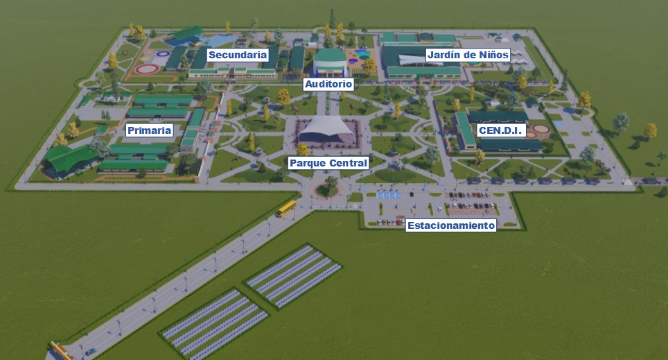 Se construirá un Campus Escolar con instalaciones escolares para preescolar, primaria y secundaria, además de un auditorio para 430 personas y un Centro de Desarrollo Infantil (CEN.D.I.).