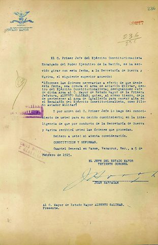 El 5 de febrero de 1915, Venustiano Carranza emitió el decreto para la creación del Arma de Aviación Mexicana; una vez concluida la Revolución Constitucionalista, esta arma inició su proceso de profesionalización, como parte del proyecto de defensa nacional.
