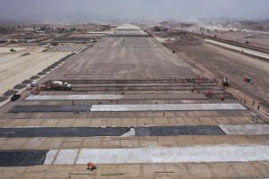 Progreso constante en la colocación del concreto MR de lo que será la capa superior de las pistas y rodaje. Avanza la colocación del drenaje pluvial para las plataformas, calles de rodaje y la Pista Norte. Precisamente en las calles de rodaje, la plataforma y la Pista Norte, se avanza con el tendido de la capa sub-base con suelo de cemento y base hidráulica.