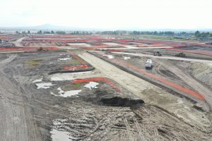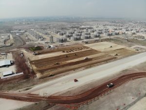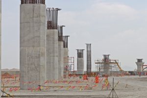 Se sustituye el terreno y se realiza la conformación de terraplenes y subrasante en vialidades, hay trabajos en la construcción de muros mecánicamente estabilizados y el colado de columnas y capiteles del viaducto elevado de acceso al nivel de salidas de la terminal de pasajeros.