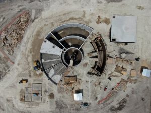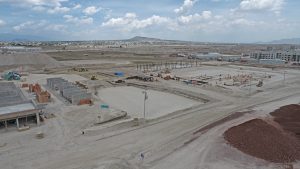 Se sigue trbajando en la abertura de cepas para contratrabes y drenaje principal, el habilitado de acero de refuerzo para losa de cimentación, tiro de concreto para plantilla en cepas para contratrabes y colocación de plástico para cimentación, contratrabes habilitadas y parrilla para losa de cimentación. Respecto a los edificios complementarios, se continúa trabajando en la conformación de terraplén con material de banco y mina, el habilitado y armado de acero de refuerzo para muros en cisterna, así como en el cimbrado de este. Asimismo, en el banco de préstamo, excavación, acarreo de material y levantamiento físico topográfico.
