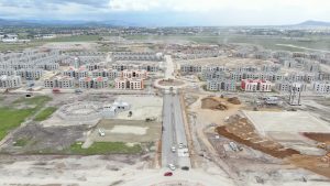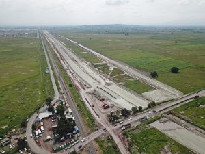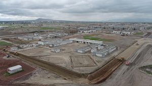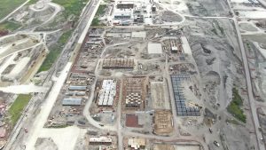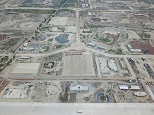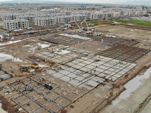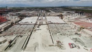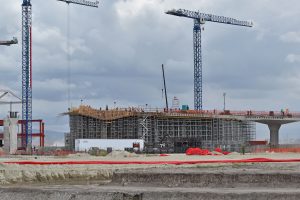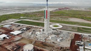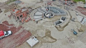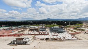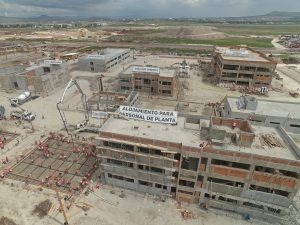 Se trabaja en el levantamiento y armado de la estructura metálica del nivel 16 de la columna. En los edificios adosados del interior se continúa trabajando en acabados de muros, colocación de tubería y soportería eléctrica, así como la instalación de ductos de aire acondicionado.