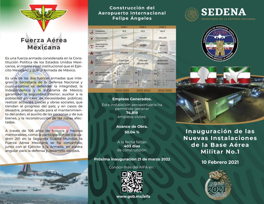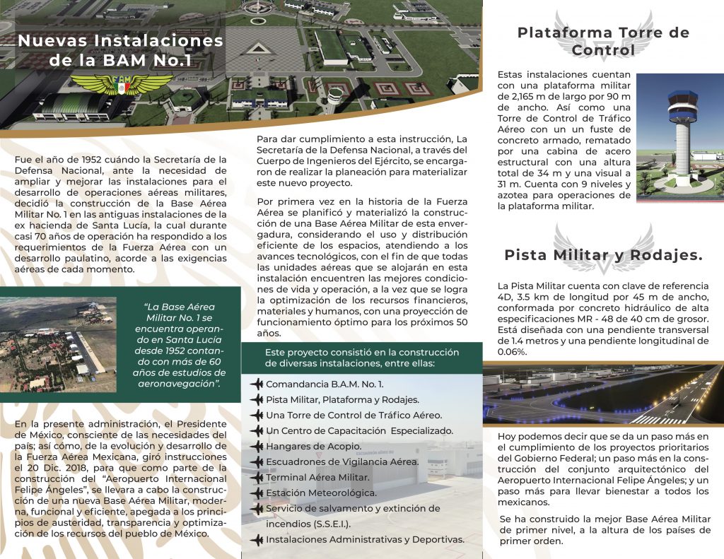 En la presente administración, el Presidente de México, consciente de las necesidades del país; así cómo, de la evolución y desarrollo de la Fuerza Aérea Mexicana, giró instrucciones el 20 de diciembre del 2018, para que como parte de la construcción del Aeropuerto Internacional General Felipe Ángeles, se llevara a cabo la construcción de una nueva Base Aérea Militar, moderna, funcional y eficiente, apegada a los principios de austeridad, transparencia y optimización de los recursos del pueblo de México