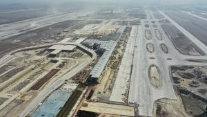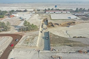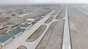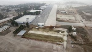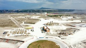 En las Calles de Rodaje y Plataformas, se realizan los trabajos de conformación de terraplén, tendido de la capa de base hidráulica, tendido de la capa de concreto magro y tendido de concreto de alta resistencia como superficie de rodamiento.