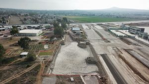 Se continúan los trabajos de terracerías y pavimentos en vialidades, así como la elaboración de pozos de visita y la colocación de tuberías para redes eléctricas, de voz y datos, hidráulicas y sanitarias. Asimismo, en el área de Transferencia de Seguridad se realizan trabajos de terracerías, habilitado y armado de acero, cimbra y colado de estructuras.